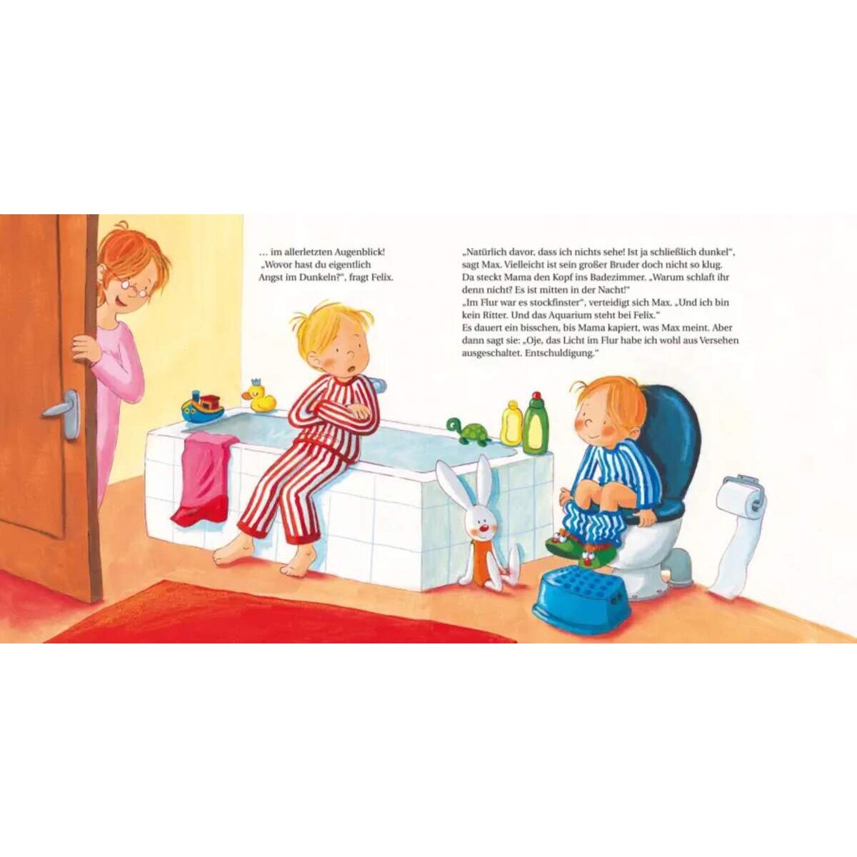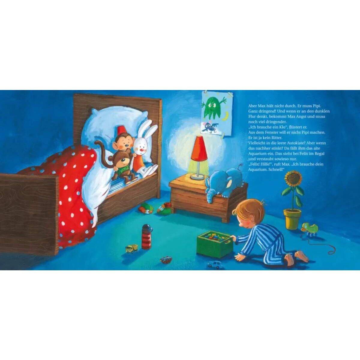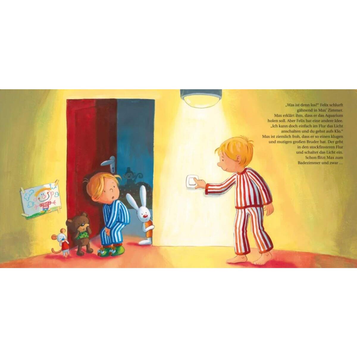 Normalerweise bleibt das Flurlicht bei Max zuhause nachts immer an. Aber ausgerechnet heute, als Max ganz dringend Pipi muss, ist das Licht aus! Es ist stockfinster im Flur. Und der Lichtschalter ist so weit weg. Max hat Angst. Aber zum Glück weiß er sich zu helfen!