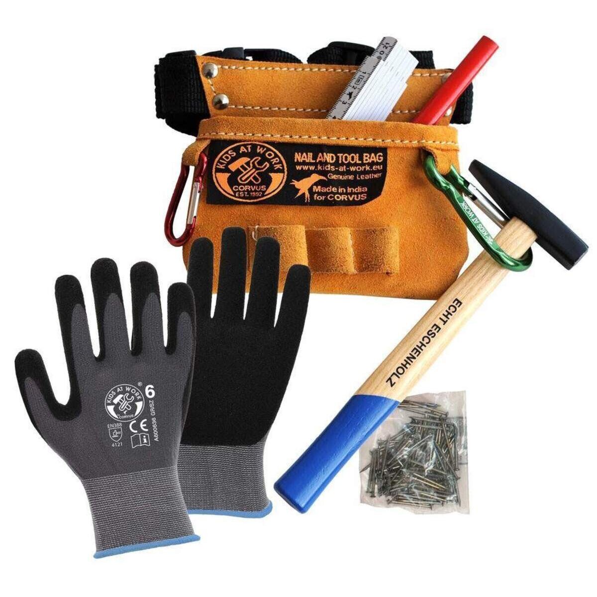 Echt lederner Werkzeuggürtel in kleiner Ausführung mit kleinem Meterstab, Hammer mit Holzgriff, Nägel, Handschuhen, Zimmermannsbleistift und zwei Karabinerhaken zum praktischen befestigen weiterer Werkzeuge. Funktionstüchtiges Bastelwerkzeug, Material oder Zubehör.