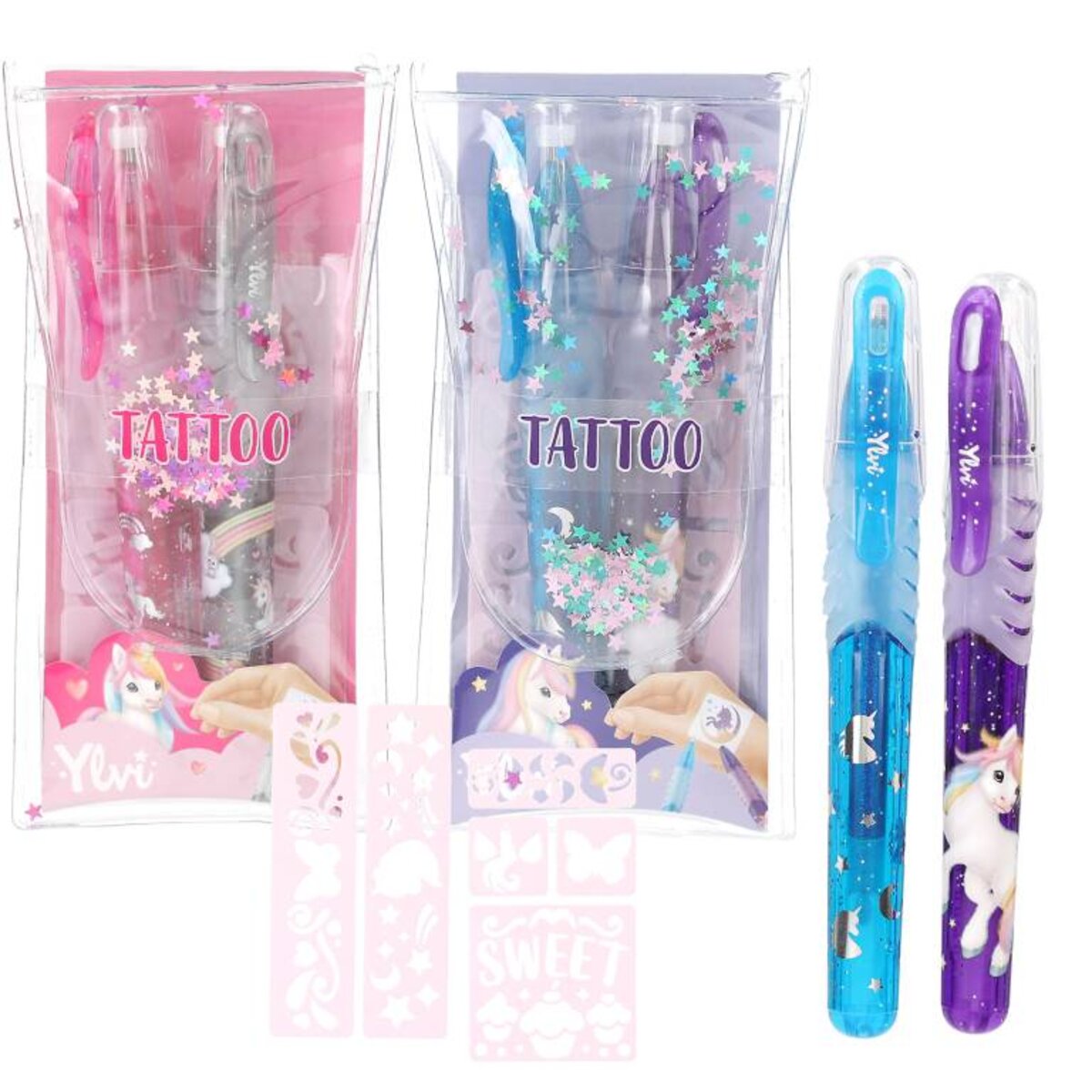 Tattoo-Spaß mit Ylvi! Das Set besteht aus 2 Tattoo-Glitzer-Stiften (rosa/grau, blau/lila) und niedlichen Motiv-Schablonen zum Aufkleben auf die Haut (wiederverwendbar). Verpackt in einem transparenten Täschchen und mit farblich passenden und schimmernden Konfetti-Sternchen in der Lasche. Doppelt gut: Die Stifte sind auch zum Malen auf Papier geeignet.