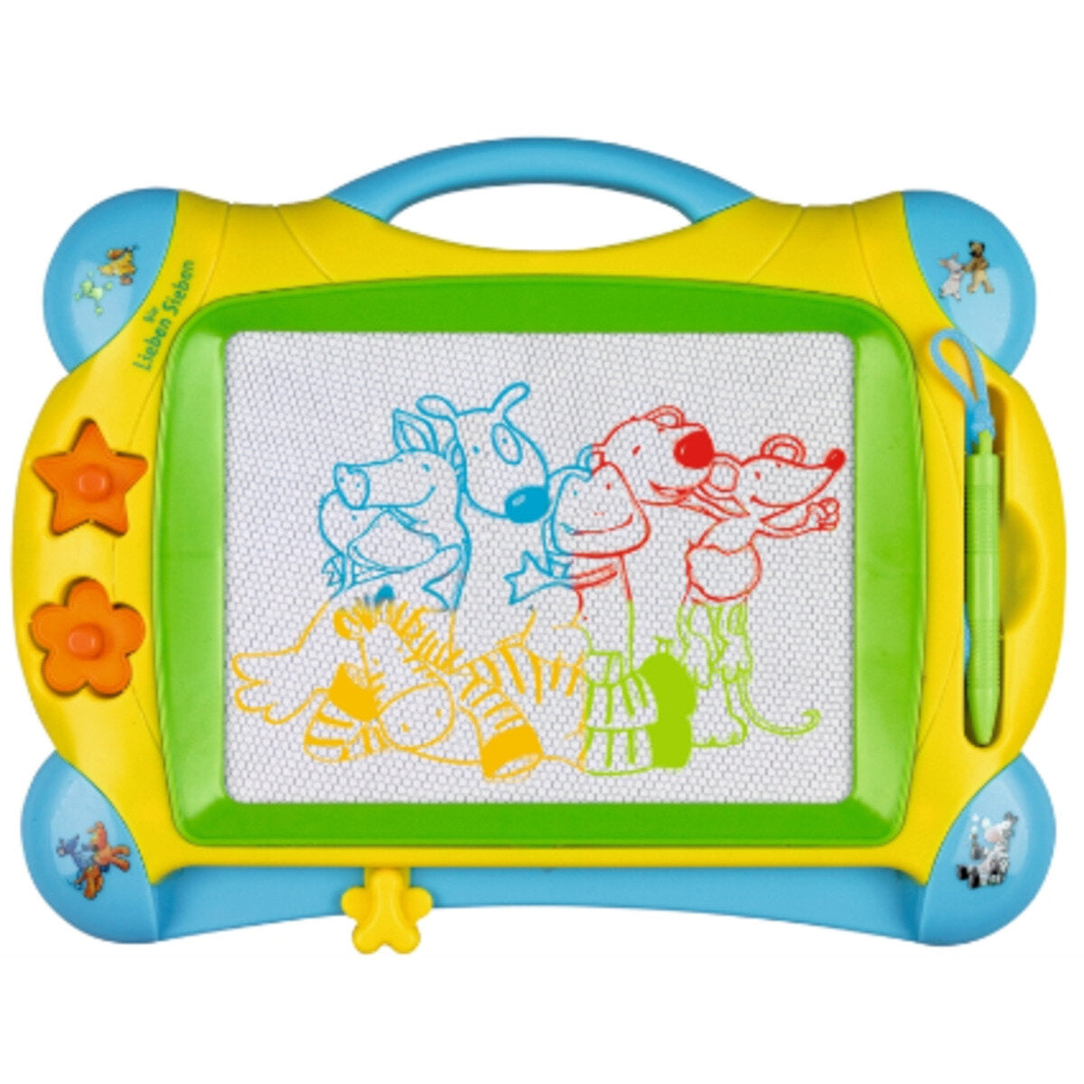 Magnetische Maltafel aus Kunststoff mit zwei Stempeln und einem Stift. Mit praktischem Tragegriff. Schreibt in Grün, Rot, Gelb und Blau!