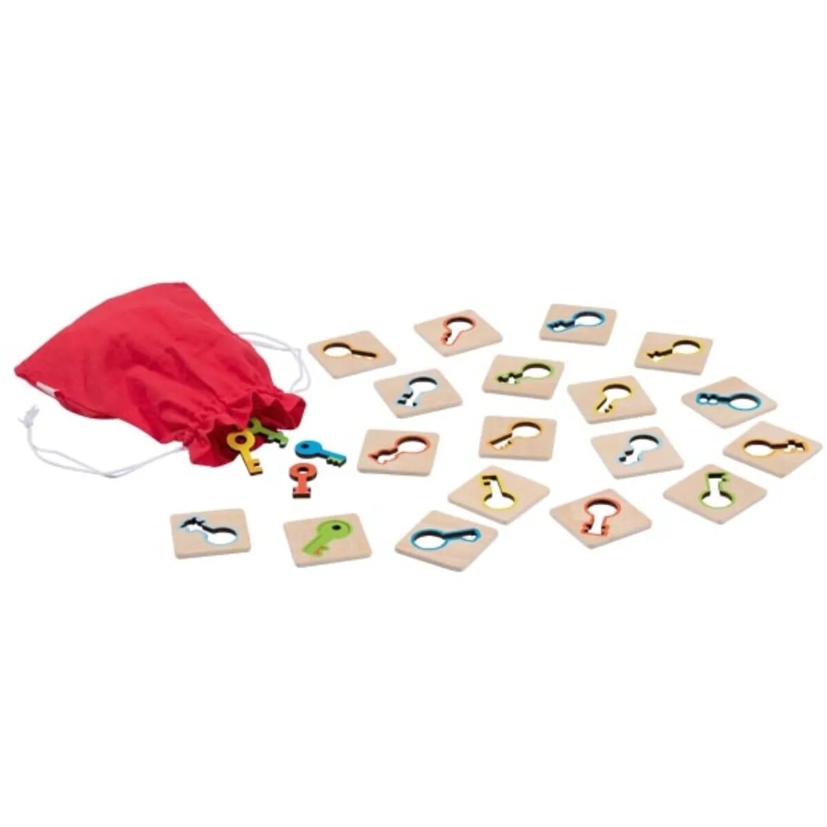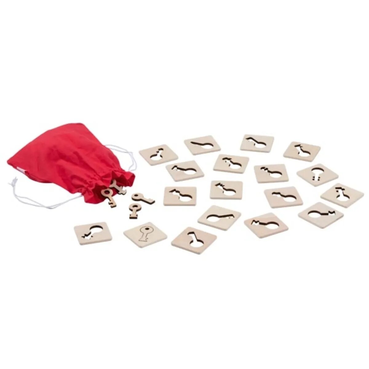 Schnelligkeit ist Trumpf bei diesem Memory aus Holz. 16 Schlüssel passen in 16 Kärtchen. Doch die Spieler müssen genau schauen. Denn jedes Paar gibt es nur einmal. Und wenn der Schlüssel aus dem Beutelchen gezogen wird, wer zeigt dann am schnellsten auf das Gegenstück? Vielleicht helfen ja auch die farbigen Markierungen.