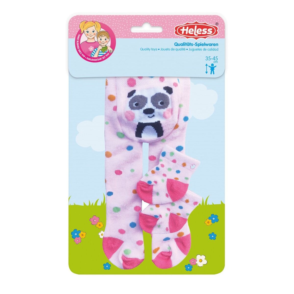 Die bunten Puppen-Strumpfhosen „Lustige Tiere“ mit Söckchen von Heless sorgen mit ihren niedlichen Tiermotiven und fröhlichen Mustern allzeit für gute Laune. Sie sind in drei unterschiedlichen Design-Varianten erhältlich: Panda mit Farbkleksen, Giraffe mit blau-weißen Streifen und Hase mit grün-weißen Ringeln. Die gute Passform der Strumpfhosen lässt auch für Windeln genug Platz. Die Strumpfhosen und Söckchen sind sehr elastisch und können somit unterschiedlichsten Puppen kinderleicht an- und ausgezogen werden. Ein farbenfroher Basic-Artikel, der jedes Puppenoutfit aufpeppt. Strumpfhose und Söckchen passen den meisten marktgängigen Puppen der Größe 35-45 cm. Sie sind auch in einer weiteren Ausführung für Puppengröße 28-35 cm (Art.-Nr. 8781) erhältlich.