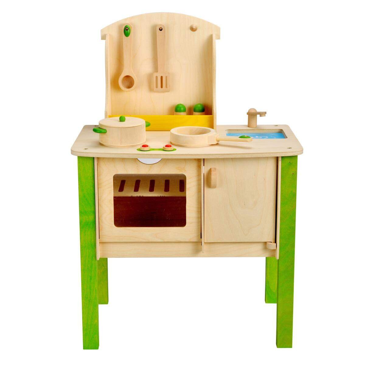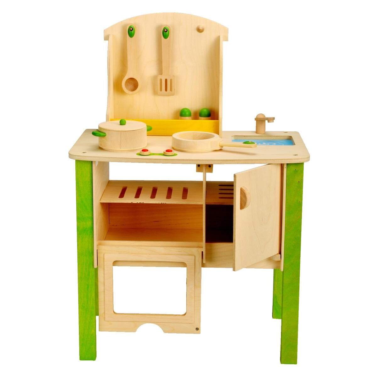 Mit dieser All-in-One Kinderspielküche "Kleine Küchenmeister" von Idena können junge Köche ihre eigenen Welten erschaffen. Das Zaubern von leckeren Gerichten für Restaurantgäste, der erste Auftritt in einer Live-Kochshow, einen Kuchen für die nächste Puppen-Teestunde backen oder das Sonntagsessen von Mama nachkochen - dies alles ist mit etwas Phantasie und dieser Küche nun in jedem Kinderzimmer möglich. Die Küche ist aus stabilem Holz gefertigt und besitzt einen Backofen mit Sichtfenster, einen Vorratsschrank mit Tür, zwei Herdplatten mit Drehknöpfen, eine Spüle mit Wasserhahn sowie ein Holzboard zum Anhängen von Kochwerkzeugen und Verstauen von Küchenutensilien.