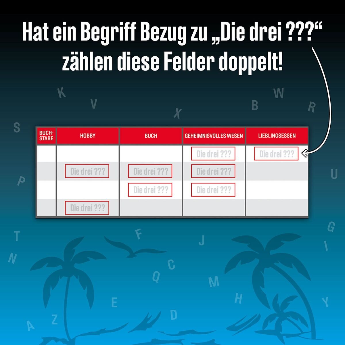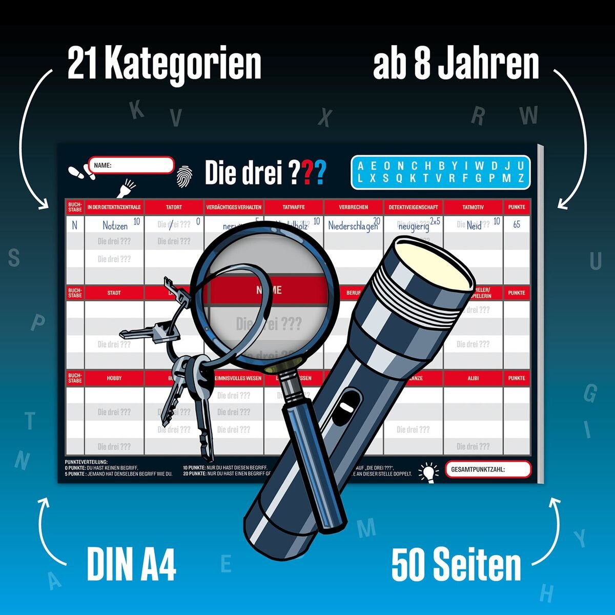 Stadt, Land, Rocky Beach! Das beliebte Stadt-Land-Fluss-Spielprinzip mit 21 unterhaltsamen und herausfordernden Kategorien passend zur Welt von „Die drei ???“. Punktet mit eurem Wissen über Detektiveigenschaften, Tatorte und Gadgets. Echtes Fanwissen zu den drei Detektiven wird gleich doppelt belohnt. Der coole Spieleblock mit den Detektiven Justus, Peter und Bob sorgt für spannenden und kreativen Ratespaß für Kinder ab 8 Jahren.