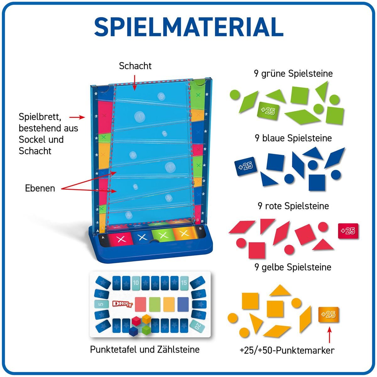 Mitfiebern strengstens erlaubt! Wo landet der nächste Spielstein? Der Reihe nach werfen die Spielerinnen und Spieler immer einen Spielstein in das Spielbrett. Die höchste Ebene, die der Spielstein erreicht, gibt die Punkte vor. Aber Vorsicht: Berührt der Spielstein gleiche Formen oder Farben, gibt es keine Punkte. Wer am Ende die meisten Punkte gesammelt hat, gewinnt dieses spannende Familienspiel. Jetzt auch mit kooperativer Variante – gemeinsam gegen das Spiel gewinnen. Geschicklichkeit, Taktik und ein wenig Glück sind hier gefragt! Kurze Regeln, großer Spielspaß – das perfekte Spiel für die ganze Familie!