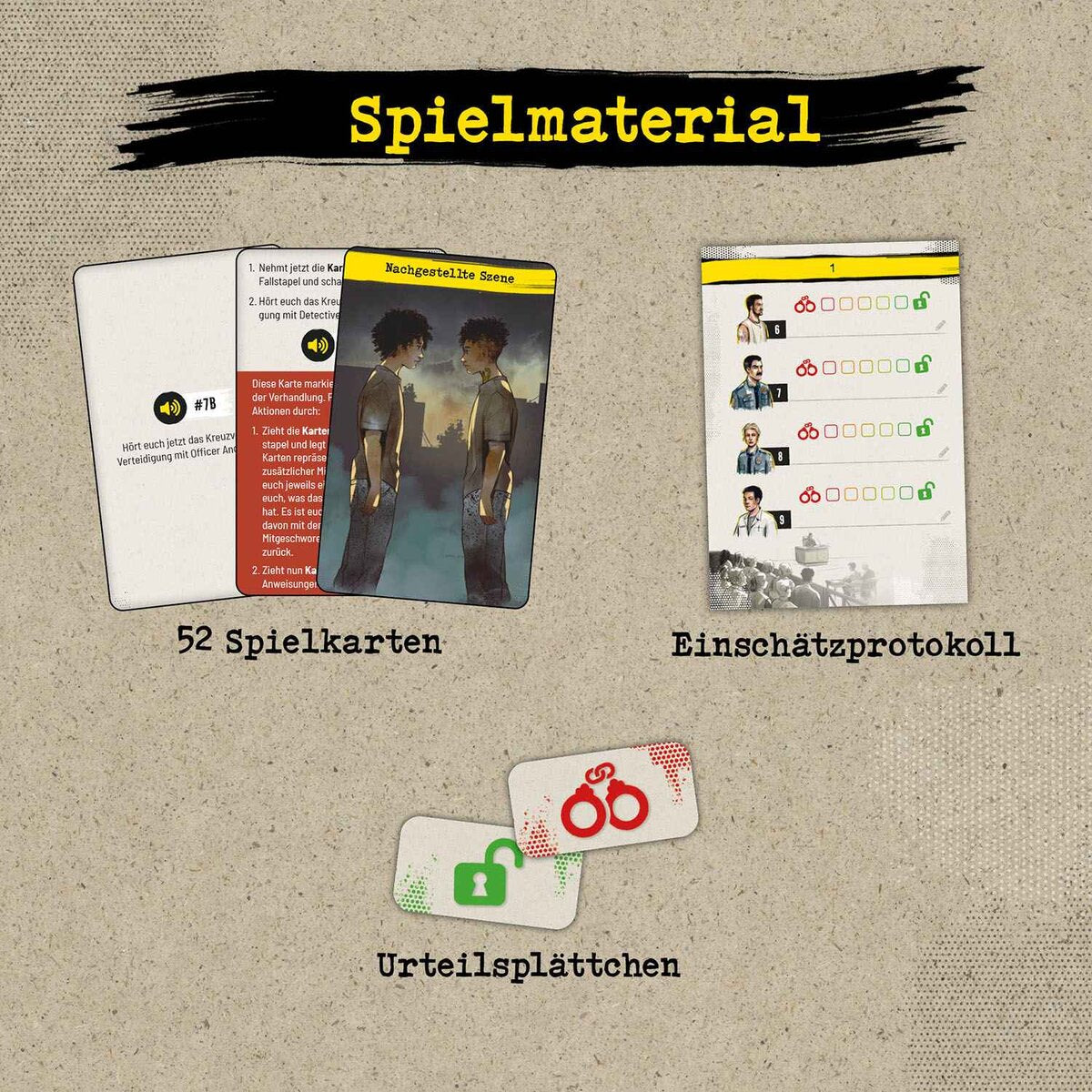 Schuldig im Sinne der Anklage?! Als Geschworene einer Jury fällen zwei bis fünf Spielerinnen und Spieler ab 14 Jahren ihr Urteil in einem Mordprozess. Hat der Angeklagte den jungen Mann auf dem Parkplatz vor einem Club wirklich erschossen? Über drei Runden diskutiert die Gruppe und tauscht sich über Erkenntnisse und aufkommende Zweifel aus. Dabei hören die Spielerinnen und Spieler Audioaufnahmen aus dem Gerichtssaal: Statements der Staatsanwaltschaft und Verteidigung sowie Befragungen von Zeugen, Polizisten und Gerichtsmedizinern liefern Hinweise. Unter Zuhilfenahme des sichergestellten Beweismittels rekonstruieren sie so gemeinsam den Ablauf, der auf einem realen Fall basiert, um eine Entscheidung über die Schuldfrage zu treffen. Interaktive True Crime Spannung für Fans von Crime Podcasts und Gerichtsserien.