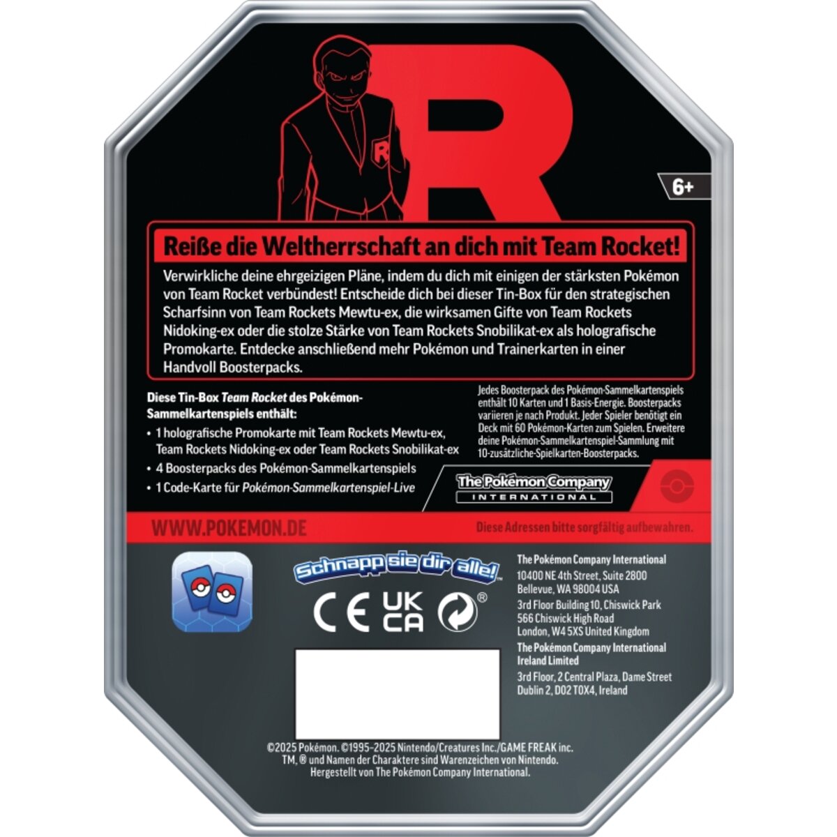 Verwirkliche deine ehrgeizeigen Pläne, indem du dich mit einigen der stärksten Pokémon von Team Rocket verbündest! Entscheide dich bei dieser Tin-Box für den strategischen Scharfsinn von Team Rockets Mewtu-ex, die wirksamen Gifte von Team Rockets Nidoking-ex oder die stolze Stärke von Team Rockets Snobilikat-ex als holografische Promokarte. Entdecke anschließend mehr Pokémon und Trainerkarten in einer Handvoll Boosterpacks.