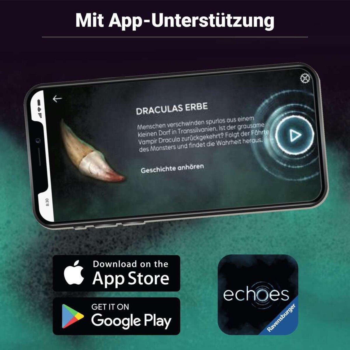 Menschen verschwinden spurlos aus einem kleinen Dorf in Transsilvanien. Ist der grausame Vampir Dracula zurückgekehrt? Die Spieler nehmen die Fährte des Monsters und versuchen, die Wahrheit herauszufinden.echoes ist ein einzigartiges, kooperatives Audio Mystery Spiel. Die Spieler hören mithilfe der kostenlosen Ravensburger echoes App mysteriöse Geräusche und Stimmen, die mit den Kartenmotiven verbunden sind. Gemeinsam bringen sie die 24 Teile der Geschichte in die richtige Reihenfolge, um den Fall zu lösen.Die kostenlose Ravensburger echoes App wird zum Spielen benötigt. Im Lauschen-Modus der App können die Spieler die Sounds abspielen. Im Lösen-Modus überprüfen die Spieler jeweils vier Karten auf ihre Reihenfolge, um Kapitel für Kapitel zu lösen. Zum Schluss müssen die Spieler die gesamte Geschichte in die richtige Reihenfolge bringen, um den Fall zu lösen.Für ein optimales Spielerlebnis mit Kamera-Erkennung wird ein Gerät mit folgenden Anforderungen benötigt: Mindestens iPhone 6s mit iOS 12.0 oder neuer / Android-Gerät mit mindestens Android 7.0 und kompatibel mit den Google-Play-Diensten für AR (Diese können auf manchen Geräten nachträglich installiert werden). Falls das Gerät diese nicht erfüllt, kann per manueller Eingabe gespielt werden.