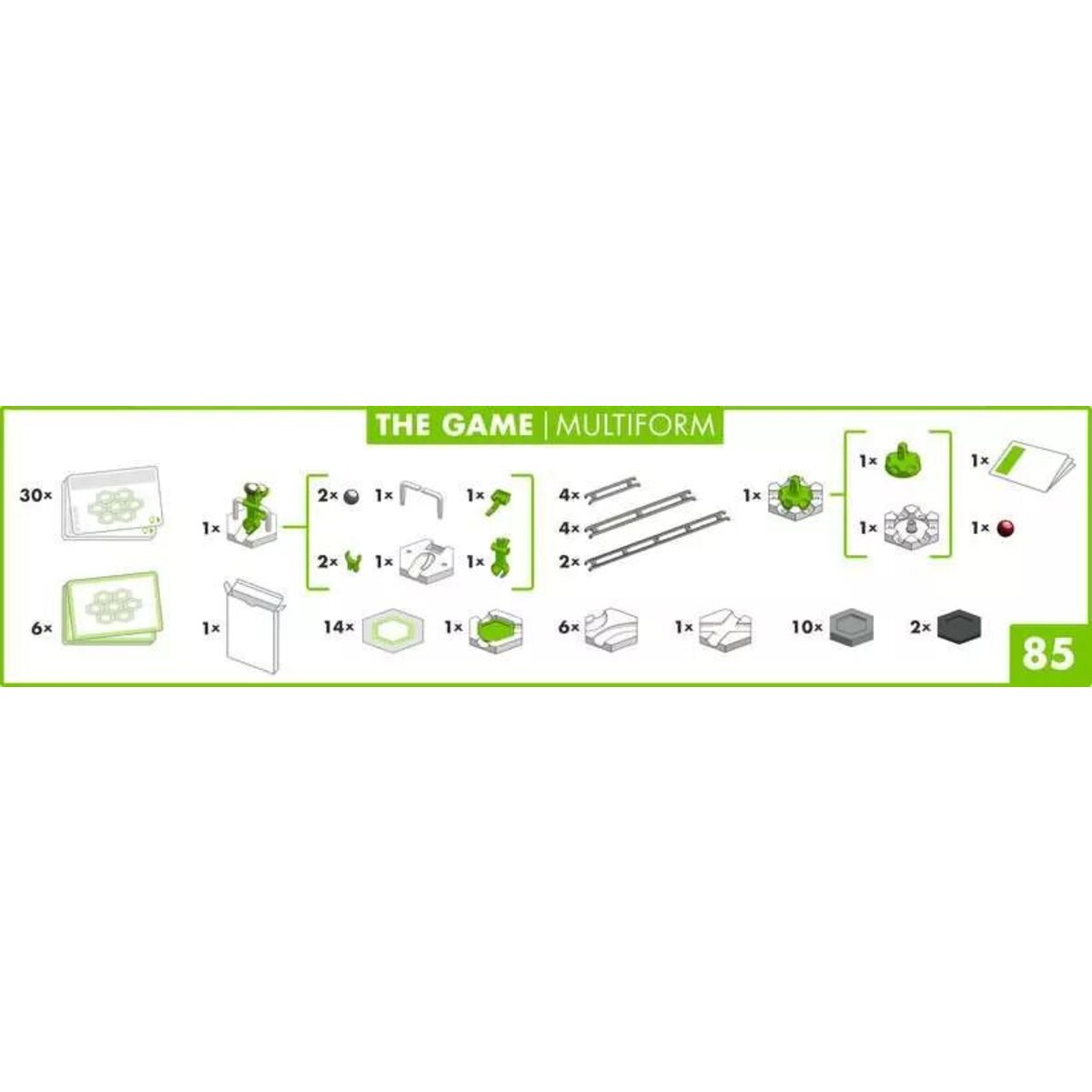 The Game besteht aus 30 Rätseln, die mithilfe von Aufgabenkarten gelöst werden. Zu Beginn wird die Position vom Startstein und Ziel angegeben. Wie muss die Bahn gebaut werden, dass die Kugel vom Start bis ins Ziel rollt? Es wird vorgegeben, welche Elemente verwendet werden dürfen. Erreicht die Kugel das Ziel, ist die Aufgabe gelöst. Bei THE GAME MULTIFORM werden die 14 kleinen, hexagonalen Grundplatten zu verschiedenen Formen gepuzzelt. Das Element Kaskade steht hier im Mittelpunkt.