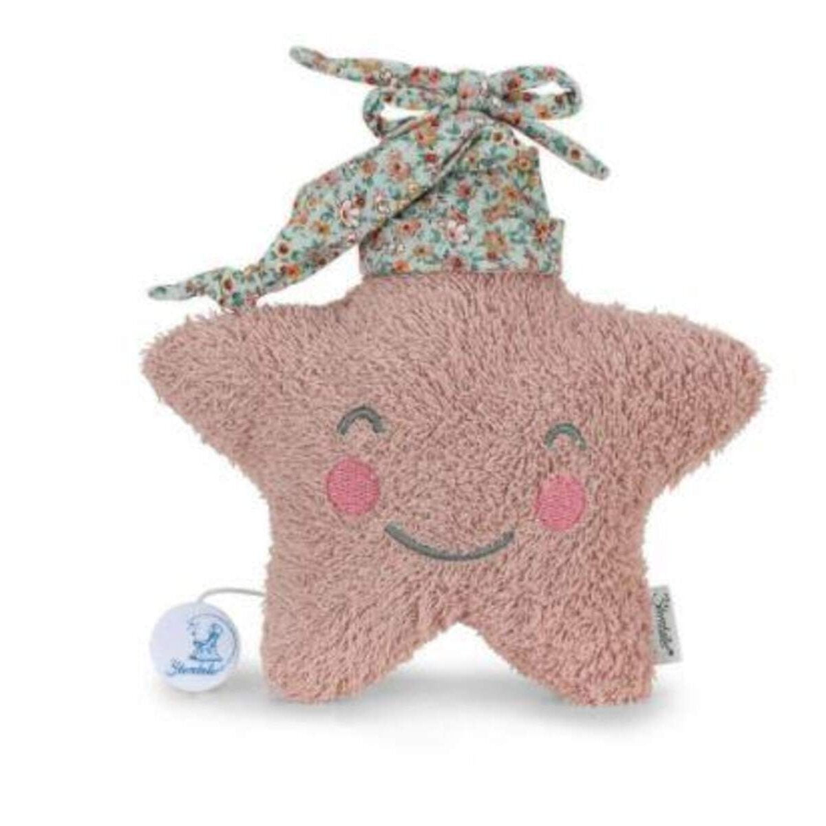 Sanft wiegt der weiche Stern Ihr Kind in den Schlaf! Aus kuscheligem Frottee und Singlejersey mit besticktem Gesicht. Der angebrachte Reißverschluss macht das Herausnehmen des Spielwerks einfach und die Figur ist problemlos waschbar. Melodie: Brahm's Wiegenlied mit Spieluhr, mit besticktem Gesicht, mit Reißverschluss, waschbar bei 40 ° Frottee: 90 % Baumwolle, 10 % Polyester; Baumwollstoff: 100 % Baumwolle