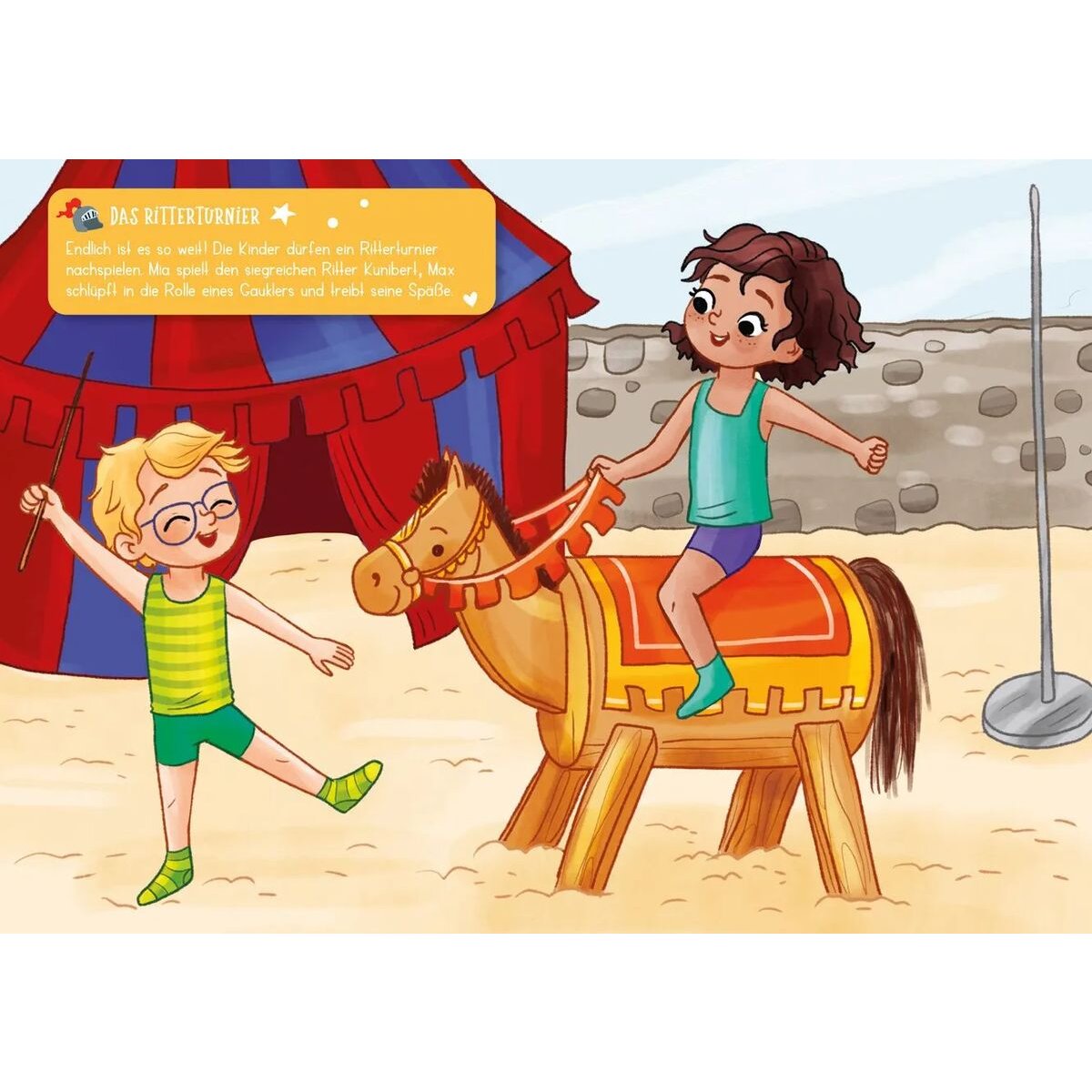 Mia und Max erleben abenteuerliche Tage auf der Ritterburg. Mit rund 150 wiederablösbaren Stickern können Kinder den spannenden Ausflug nach Lust und Laune selbst gestalten. Mia im Ritterkostüm und Max als Burggespenst? Der Fantasie sind keine Grenzen gesetzt. Symbole helfen dabei, die richtigen Sticker zuzuordnen. So können auch schon kleinere Kinder ab 4 Jahren eigenständig lebendige Szenen kleben. Und weil das Format schön handlich ist, lässt sich das Stickerheft wunderbar mitnehmen. Da kommt auch unterwegs keine Langeweile auf.
