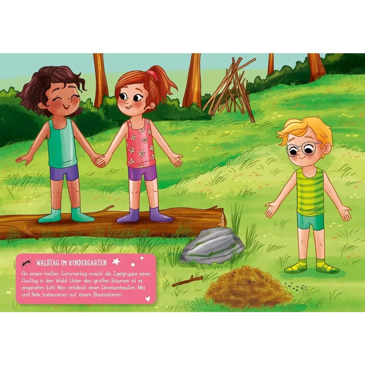 Max und Mia verbringen aufregende Tage im Wald. Wer den Wald erkundet, braucht natürlich passende Kleidung: Kurze Hosen und T-Shirts für einen Sommertag am Bach, Regenkleidung für die herbstlichen Pfützen und warme Sachen für einen Winterausflug zur Futterkrippe. Mit über 150 Stickern ist für jedes Abenteuer die passende Kleidung für Max und Mia dabei. Mit Hilfe von kurzen Texten und Symbolen ist es ganz einfach, das passenden Outfit und die richtigen Motive für die Gestaltung der Seite zu finden. Das Outfit gefällt nicht? Kein Problem, die Sticker lassen sich ablösen und neu ankleben. Die perfekte Beschäftigung für unterwegs für Kinder ab 4 Jahren.