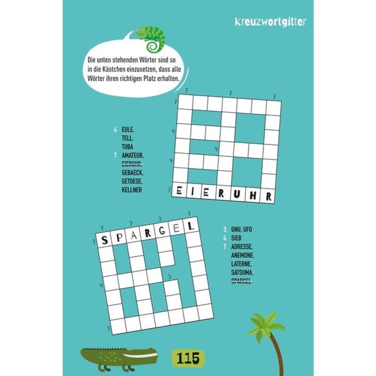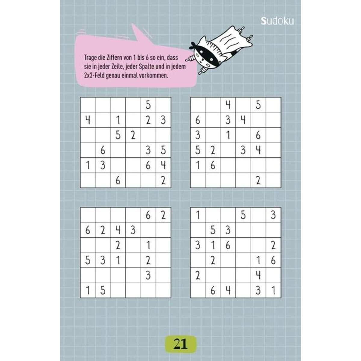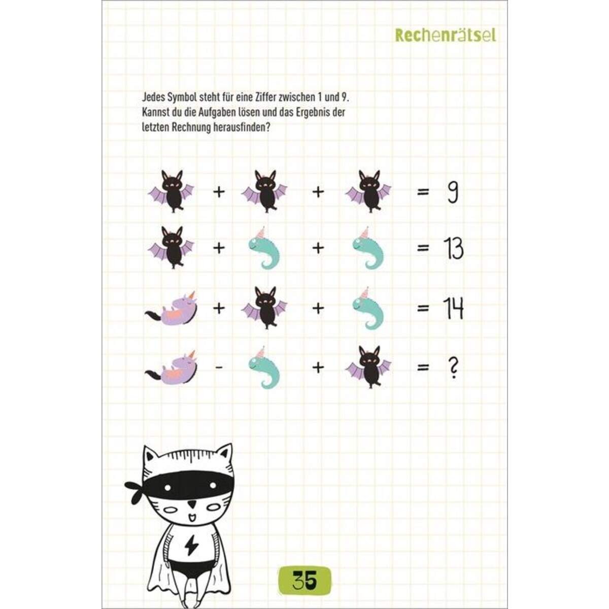 Neben klassischen Buchstaben-, Zahlen- und Bilderrätseln bietet dieser abwechslungsreiche Rätselblock auch ungewöhnlichen Denkaufgaben wie Schüttelschwedenrätsel, Wörterverwandlungen und geheimen Zeichen. Zudem können sich die Knobelfreunde auf die Suche nach doppeldeutigen Wörtern machen oder Sudokus mit Zahlen und Buchstaben lösen. Was hat man manchmal vor dem Kopf? Welches Tier versteckt sich in SCHLAMASSEL? Und welche Summe ergibt sich aus der Addition von 44 und 38? Auf insgesamt 128 Seiten warten Knobeleien aus der Feder des bekannten Rätselmachers Stefan Heine auf schlaue Füchse. Ist ein Rätsel geknackt, können die Kinder das Ergebnis mit der Lösung auf der Rückseite abgleichen.