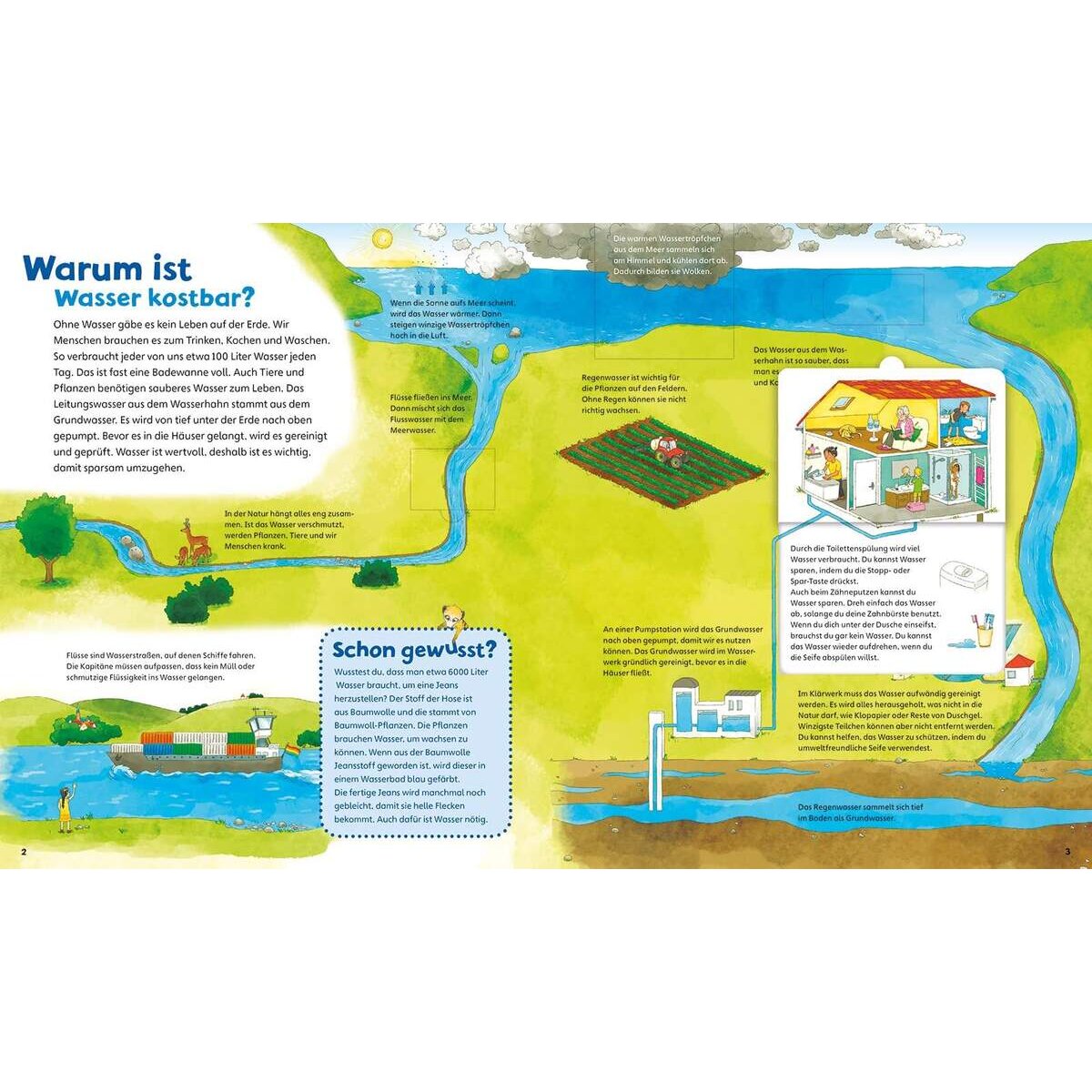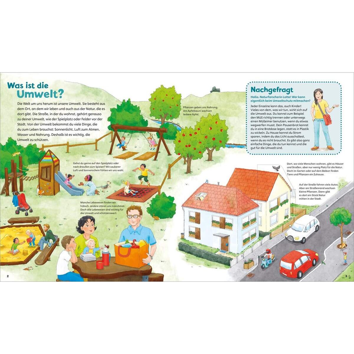 Unsere Umwelt – das sind nicht nur die Felder und Wälder vor der Stadt, sondern auch das eigene Wohnviertel, der Park oder der Spielplatz. Dort gibt es frische Luft zum Atmen, Tiere und Pflanzen, Wasser und Nahrung. Auf Augenhöhe der Kinder erklärt das Buch grundlegende Zusammenhänge wie den Wasserkreislauf und die Bedeutung von Bäumen. Auch komplexe Themen wie die Entstehung des Klimawandels, Stromgewinnung aus Wind und Wasser und Müllvermeidung werden leicht verständlich erläutert. Der Schwerpunkt des Buches liegt auf dem kindlichen Alltag, daher enthält es jede Menge Tipps, was bereits jüngere Kinder selbst tun können, damit es der Umwelt gut geht: Beim Verlassen des Zimmers das Licht ausschalten, sich um Blühpflanzen auf dem Balkon kümmern oder mit dem Fahrrad zur Kita fahren. Bei allen Erklärungen kommen viele Entdecker-Klappen, Mitmach-Rubriken und erstaunliche Fakten zum Einsatz - eine Schatzkiste voller Wissen und Ideen für den Umweltschutz!