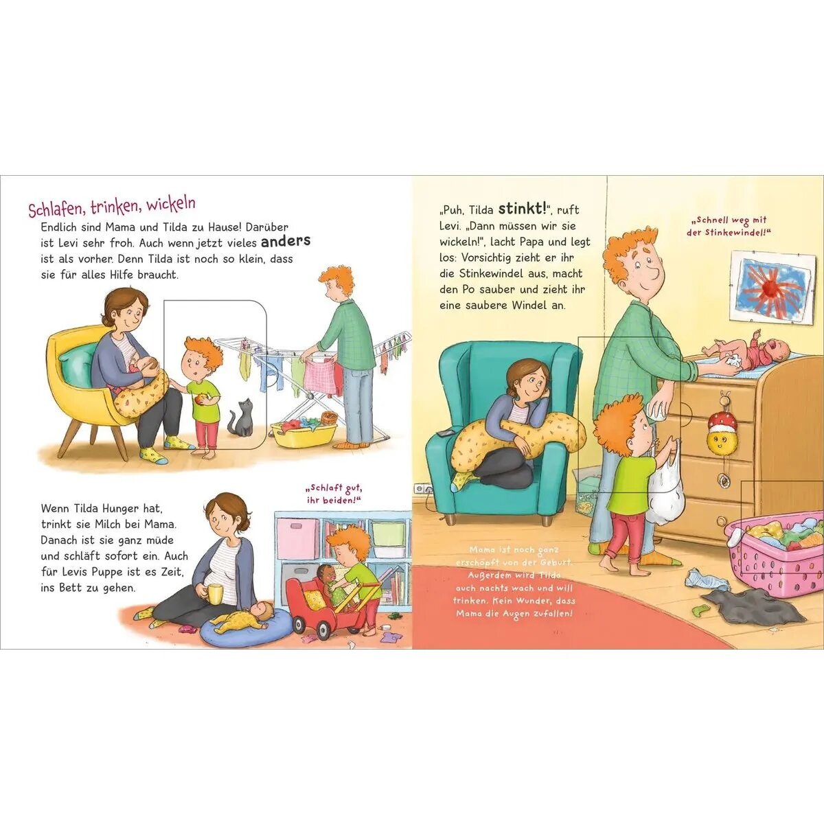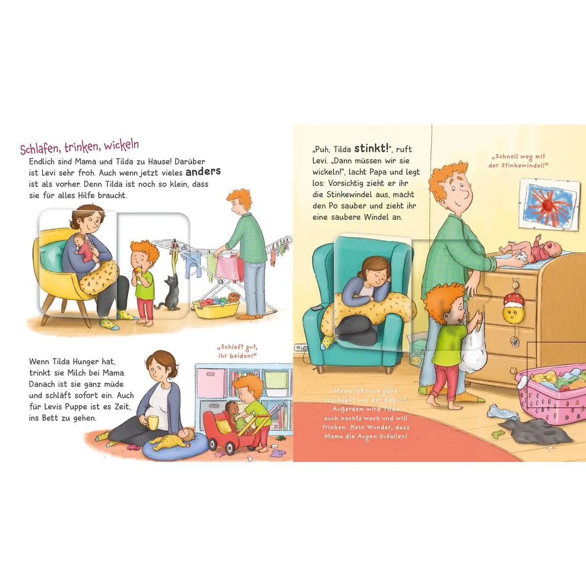 Endlich ist es soweit! Das lange Warten hat ein Ende und das neue Familienmitglied ist da! Jetzt sind sie zu viert - und Levi ist ein sehr stolzer großer Bruder! Das Baby muss gefüttert und gewickelt werden, und Levi kann helfen: Die stinkende Windel wirft er in den Müll. Und wenn das Baby weint, zieht er die Spieluhr auf. Als großer Bruder hat er viele tolle Aufgaben. Eine warmherzige Geschichte mit witzigen Illustrationen. Ein einfühlsames Vorlesebuch mit Klappen, die Spaß machen - für Kinder ab 2 Jahren.